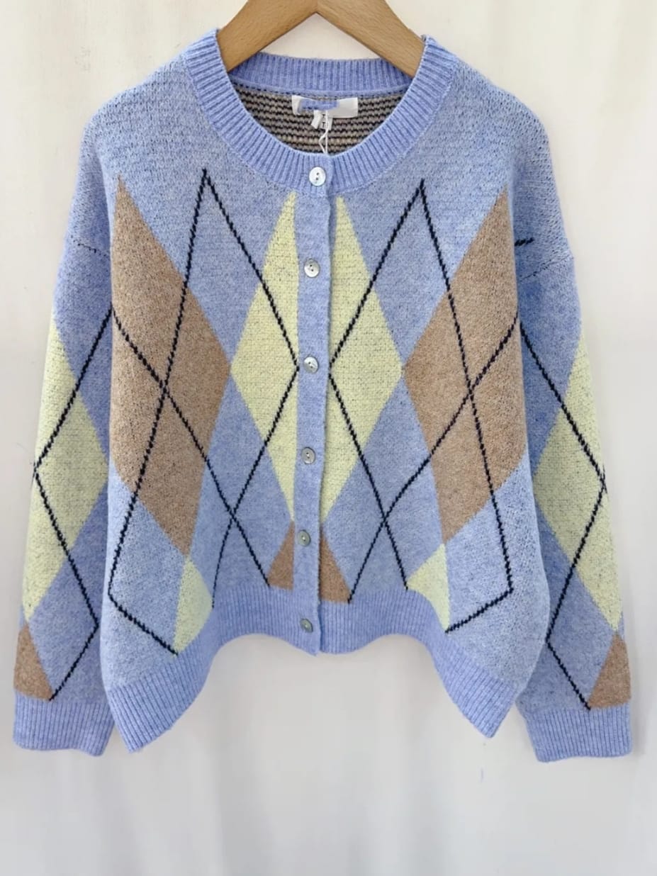 Soft knit diamond cardigan with round neck and button fastening