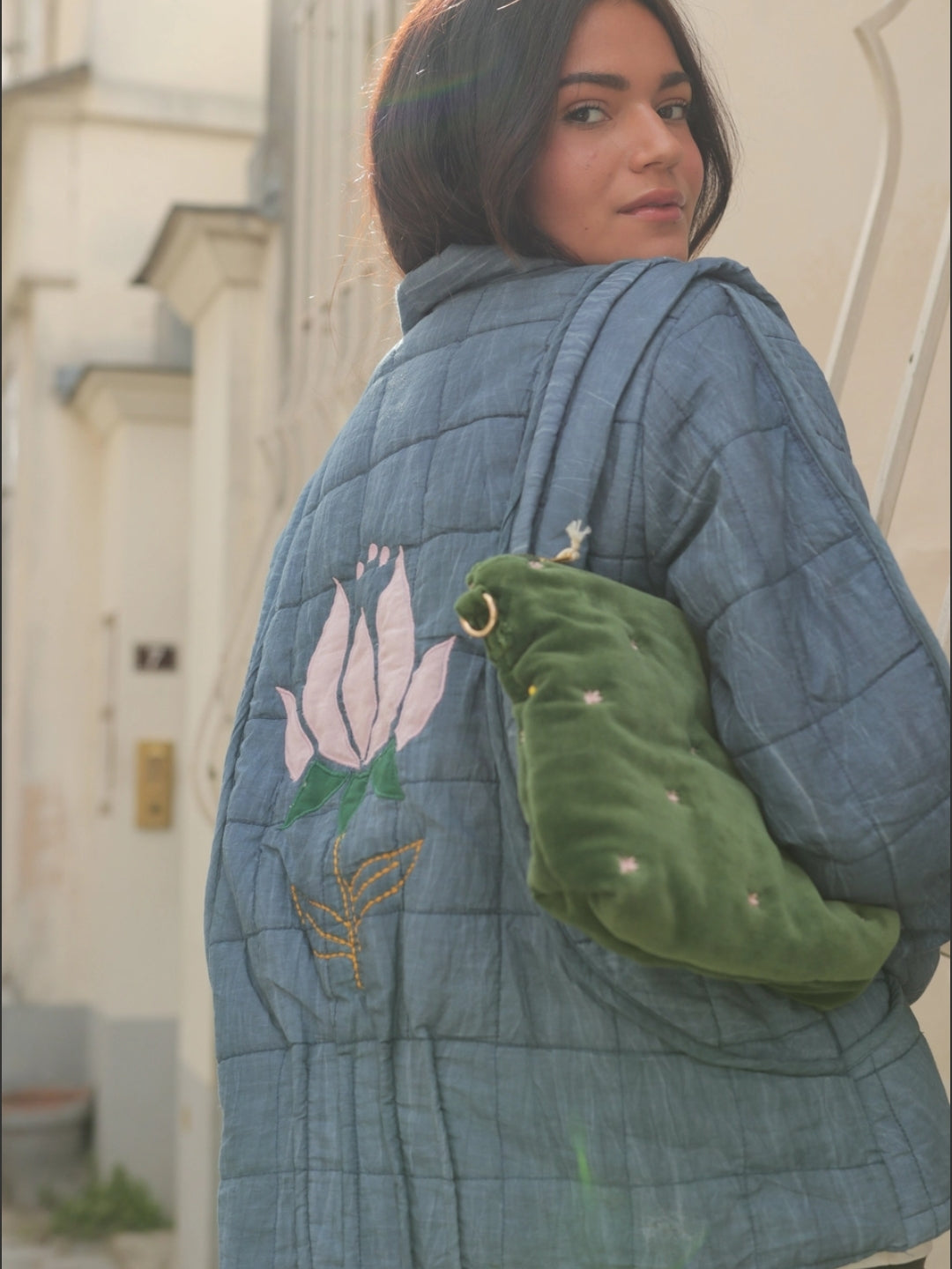 100% cotton quilted jacket, adorned with handcrafted floral embroidery on the back. Its lightweight and breathable fabric makes it a comfortable piece, ideal for mid-season.