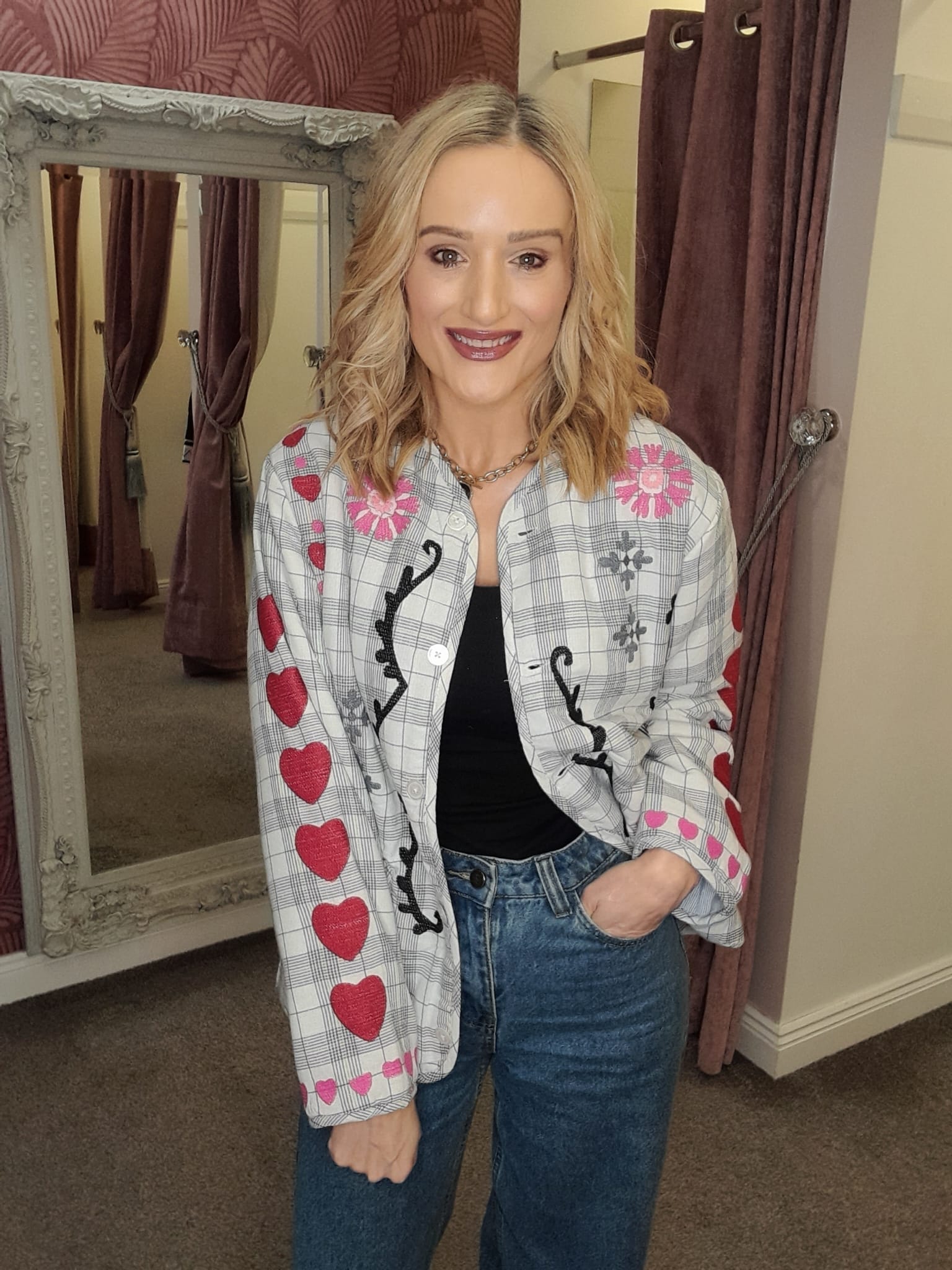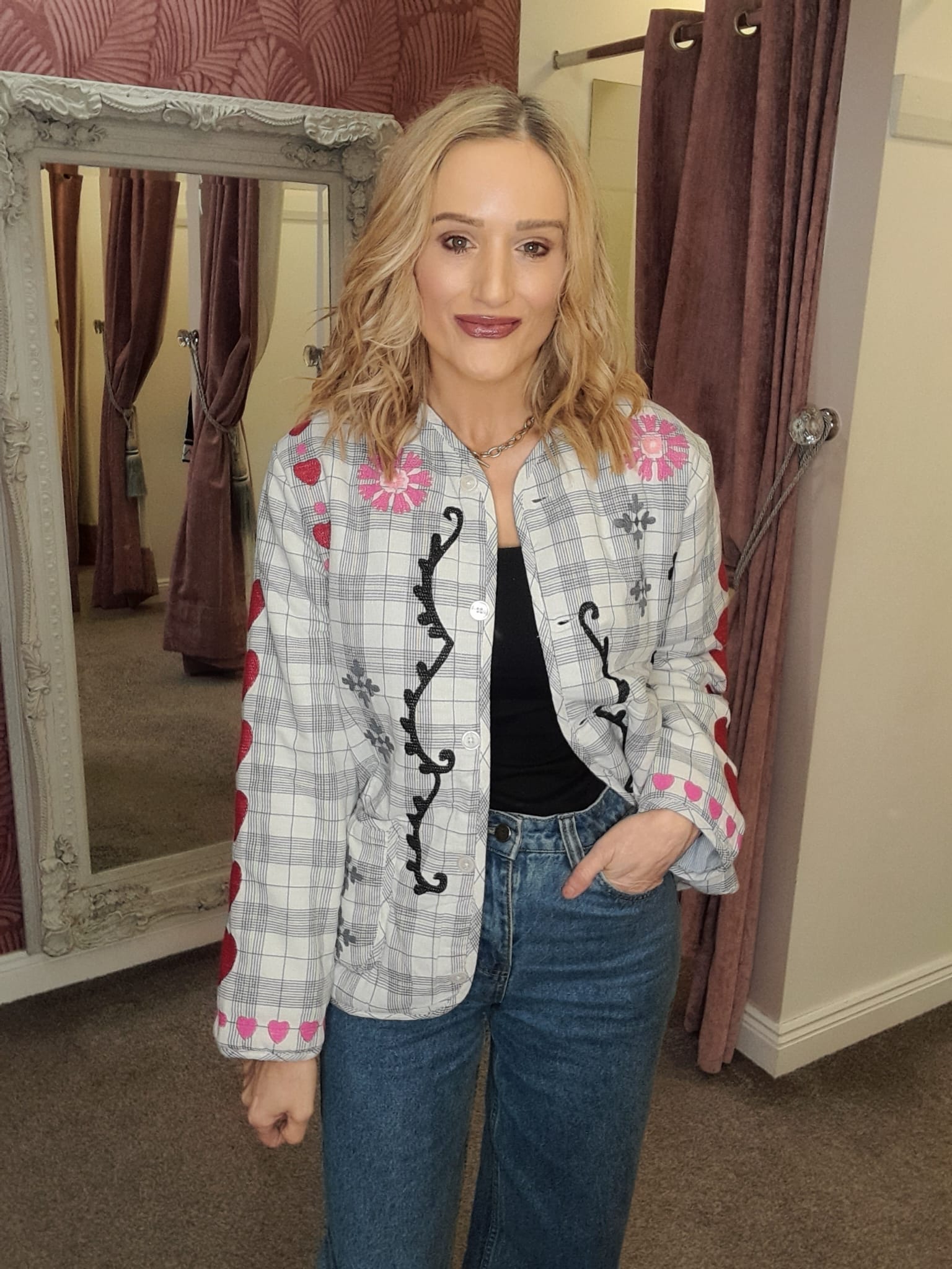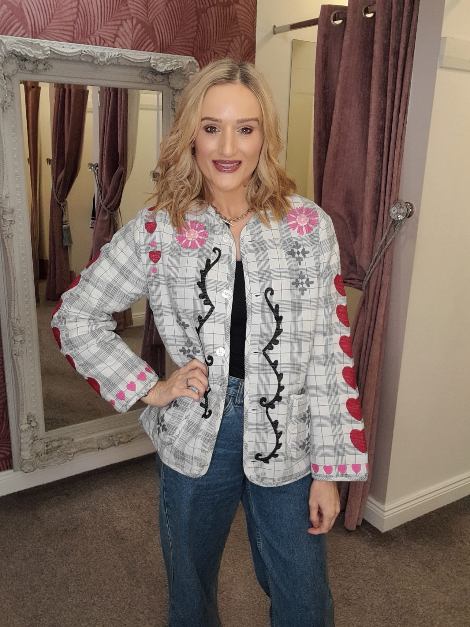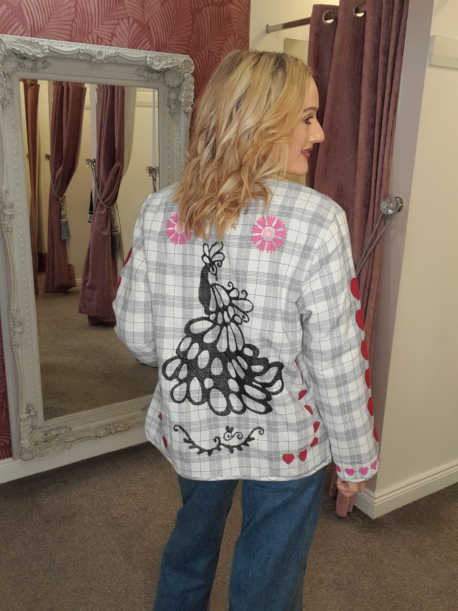 Checkered jacket Flower, heart, and peacock embroidery Button closure and 2 pockets Model height: 174 cm.