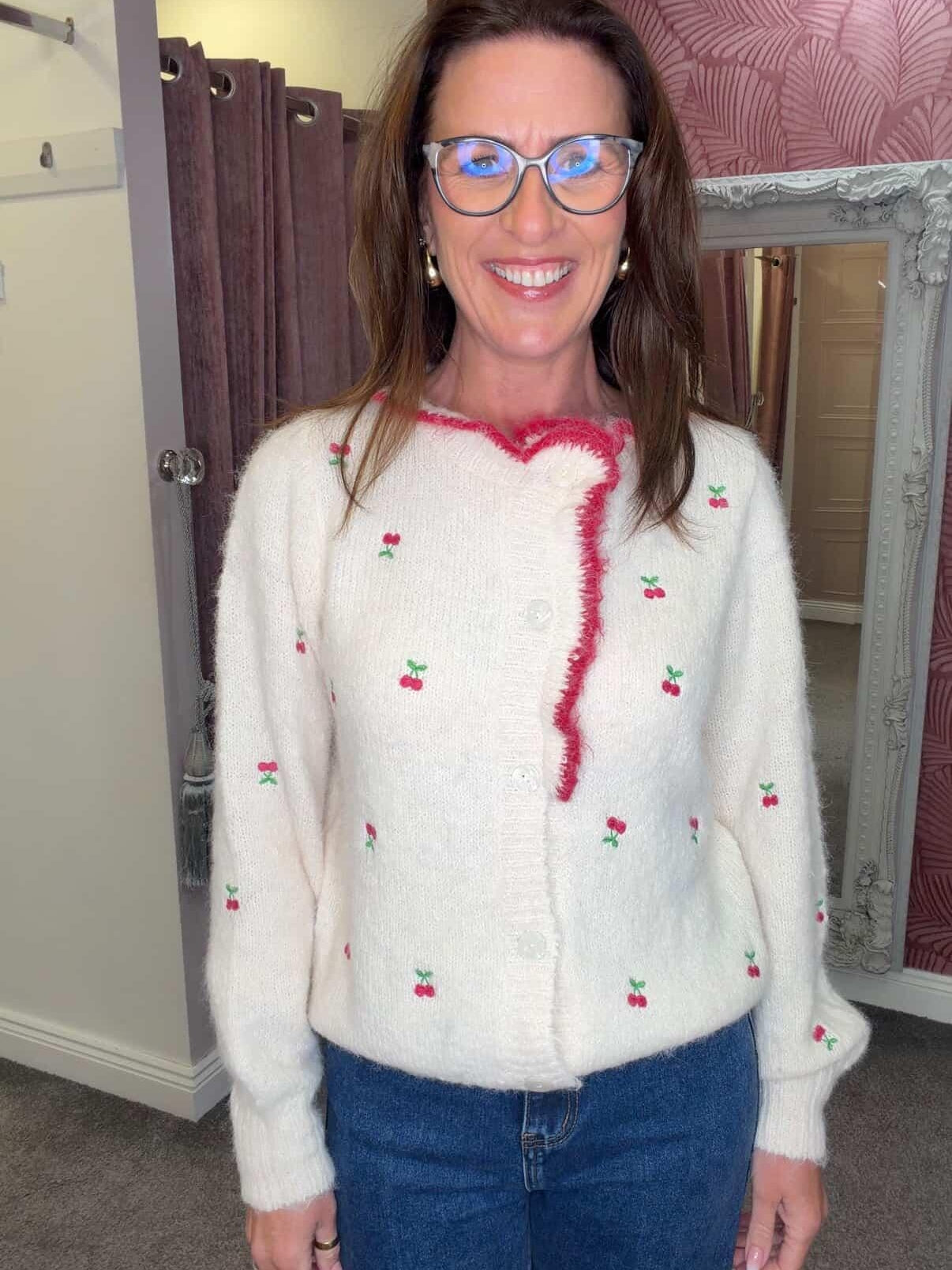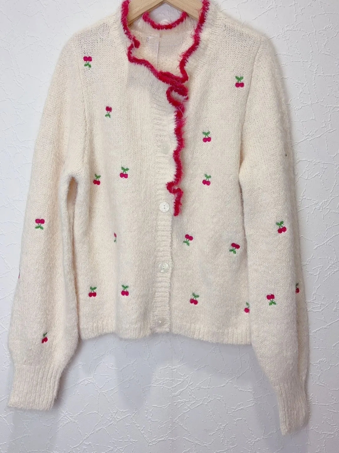 Soft knit cardigan with cherry print.