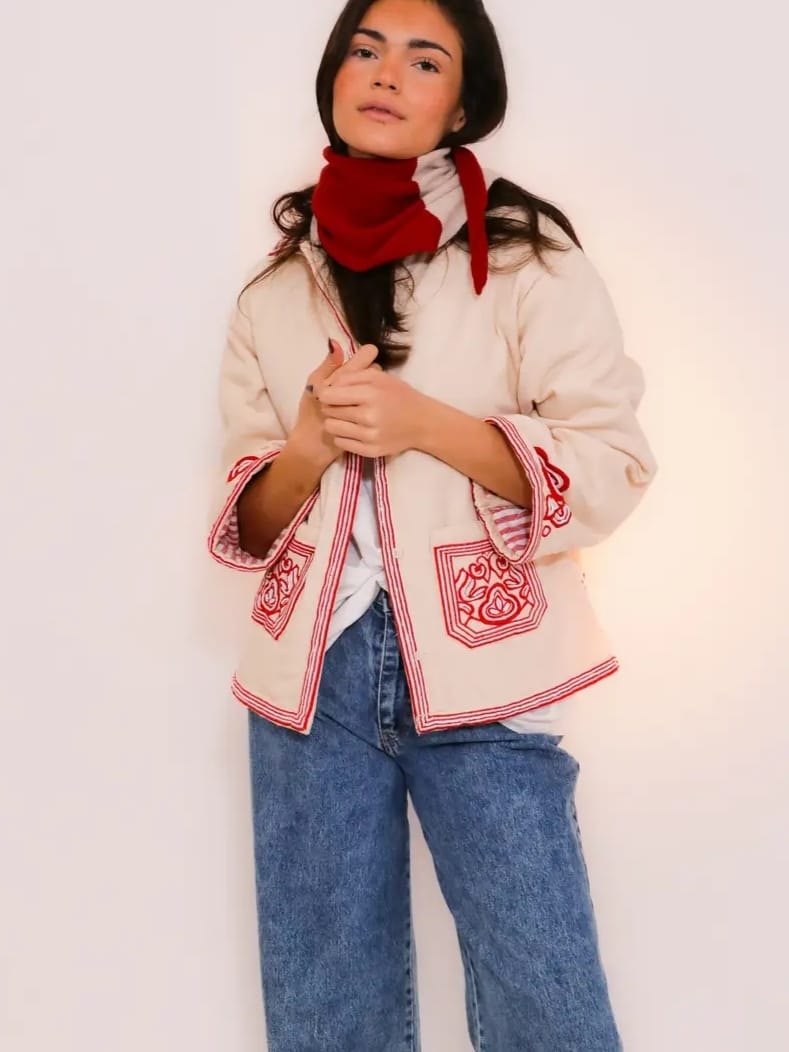 Lightly quilted jacket with embroidered detail and bead embellishment. Front square pockets and button fastening