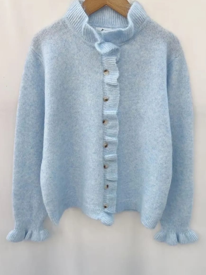 Soft fluffy knit cardigan with ruffle detail collar and cuff and button fastening